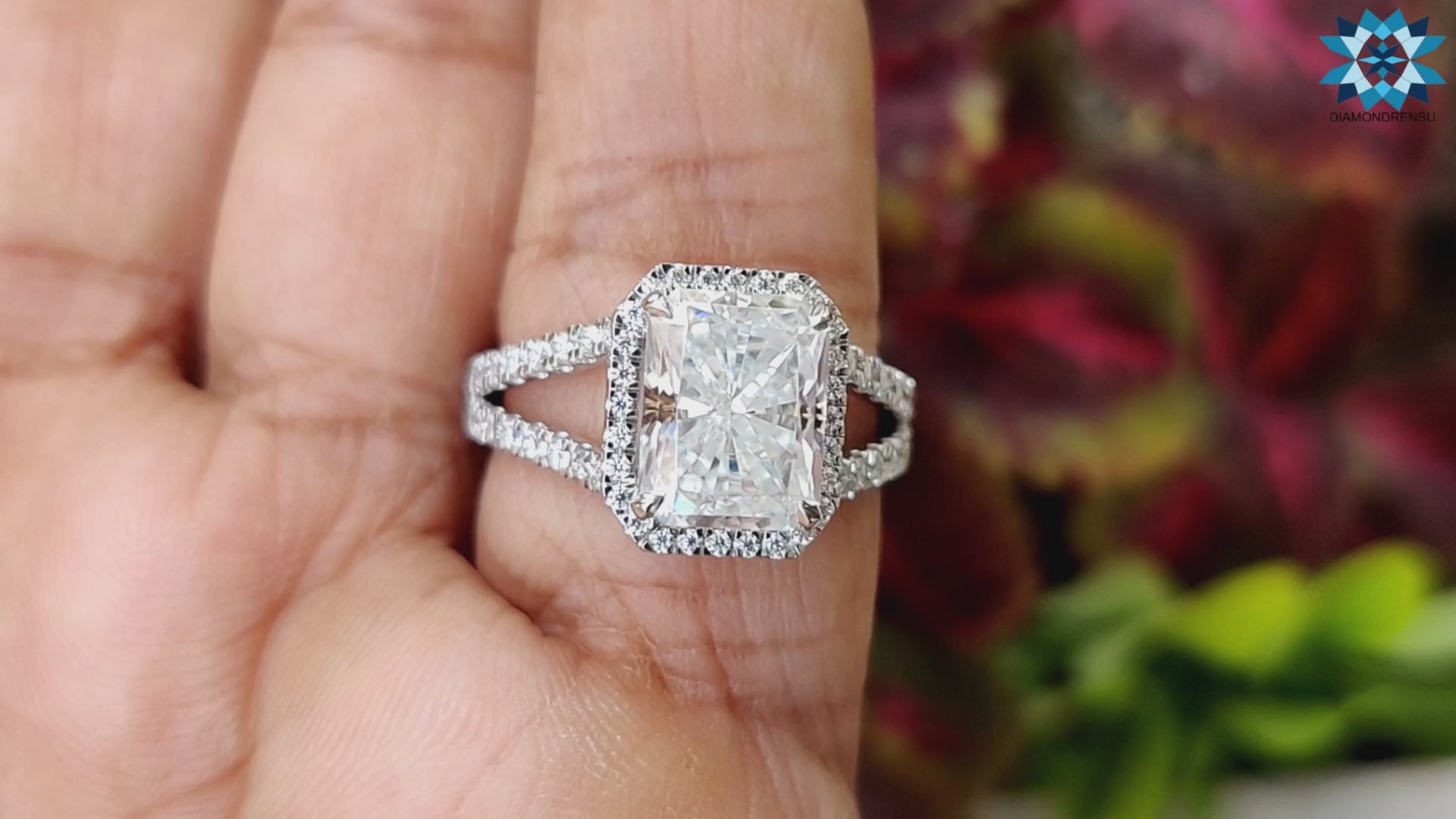 3.58 TCW Radiant Cut Split Shank Moissanite Halo Engagement Ring